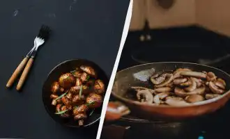 - Maak ondertussen een koekenpan: snipper de ui en rasp de wortel. Bak 2-3 minuten in een hete pan met olie. Snijd de champignons in plakjes en voeg toe aan de groenten. Bak alles samen 5 minuten. Giet er dan wat bouillon uit de pan bij, stoof nog 2 minuten en zet uit.